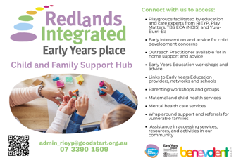 Redlands Integrated Early Years Place (RIEYP) is a not-for-profit initiative funded by The Department of Education and operated by Goodstart Early Learning in partnership with The Benevolent Society.