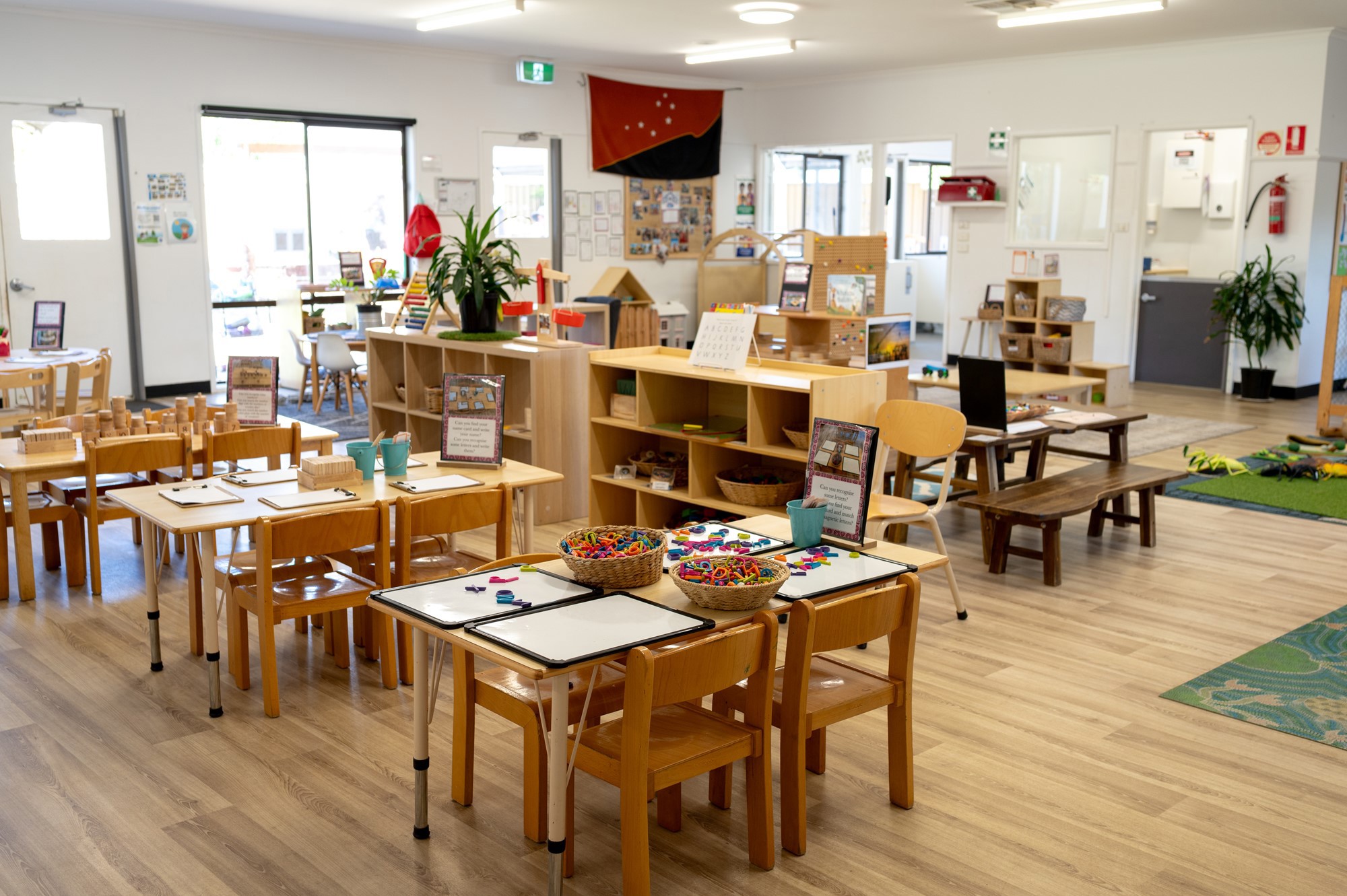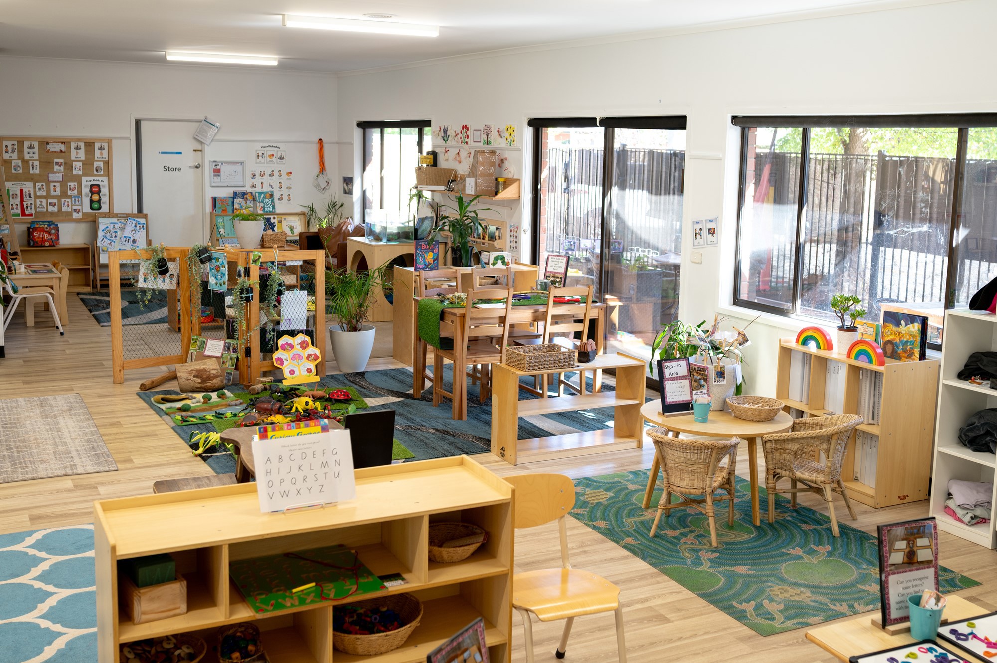 Inside, all of the rooms - from Nursery (0-2), learning space two (2-3) and our kinder (4-5)- are environments purposefully set up in line with an Early Years Learning Framework, with sensory and play based learning opportunities. Colourful, stimulating surrounds ensure the children have the chance to grow and develop through sensory and play-based learning.