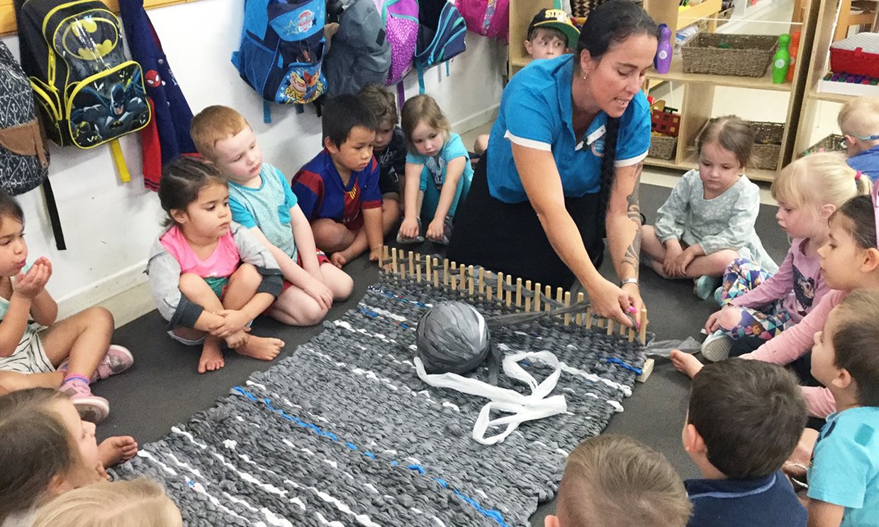 Recycling plastic bags has been taken to a new level at Goodstart Helensvale, with staff and children weaving them into plastic mats for the homeless.