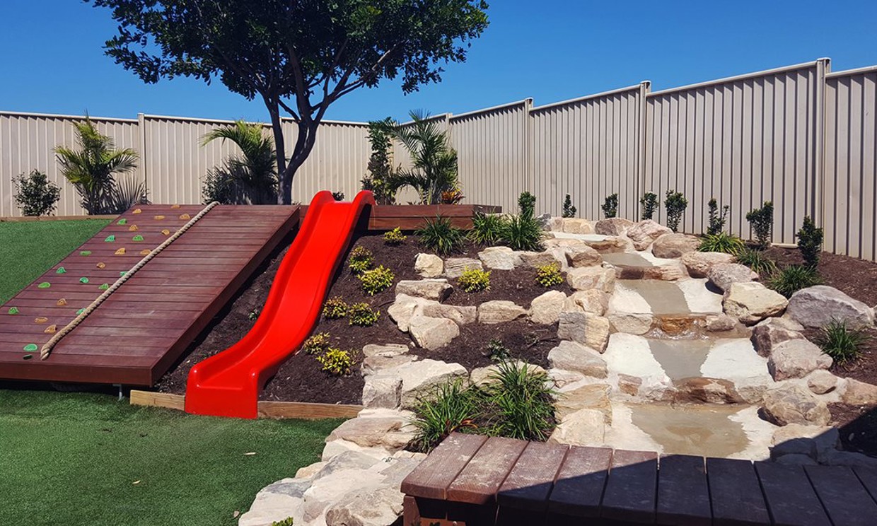 - A rock wall, climbing logs, rambling slope and terraced rockery
